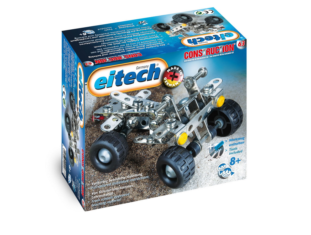 Mit diesem Metallbaukasten können Sie und Ihre Kinder ein Quad bauen. Spielerisch wird Ihr Kind mit den eitech-Metallbaukästen in die Welt der Technik eingeführt. Dieses Set ist besonders gut für Einsteiger geeignet. Der pädagogische Wert der Bausets ist auch nicht zu verachten, da motorische und kreative Fähigkeiten zugleich trainiert werden. Ebenso wird die Herausbildung dreidimensionaler Denkstrukturen gefördert. Aus diesen Gründen sind die eitech-Metallbaukästen auch an Schulen anerkanntes Lehrmaterial und werden im Unterricht eingesetzt. Alle Bauteile sind miteinander verbaubar und durch Ergänzungssets beliebig erweiterbar. Das passende Montagewerkzeug und eine detaillierte, bebilderte Bauanleitung sind im Lieferumfang des Artikels enthalten.