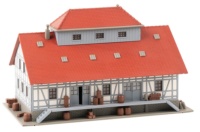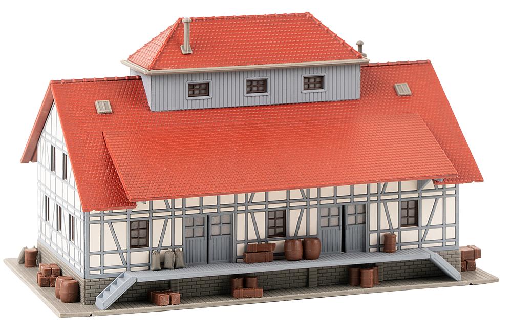 Geräumiges Lagerhaus mit gemauertem Sockel, Fachwerk mit heller Ausfachung, einem Dachaufsatz und beidseitigen Laderampen nach einem Originalvorbild in Stadtlauringen.