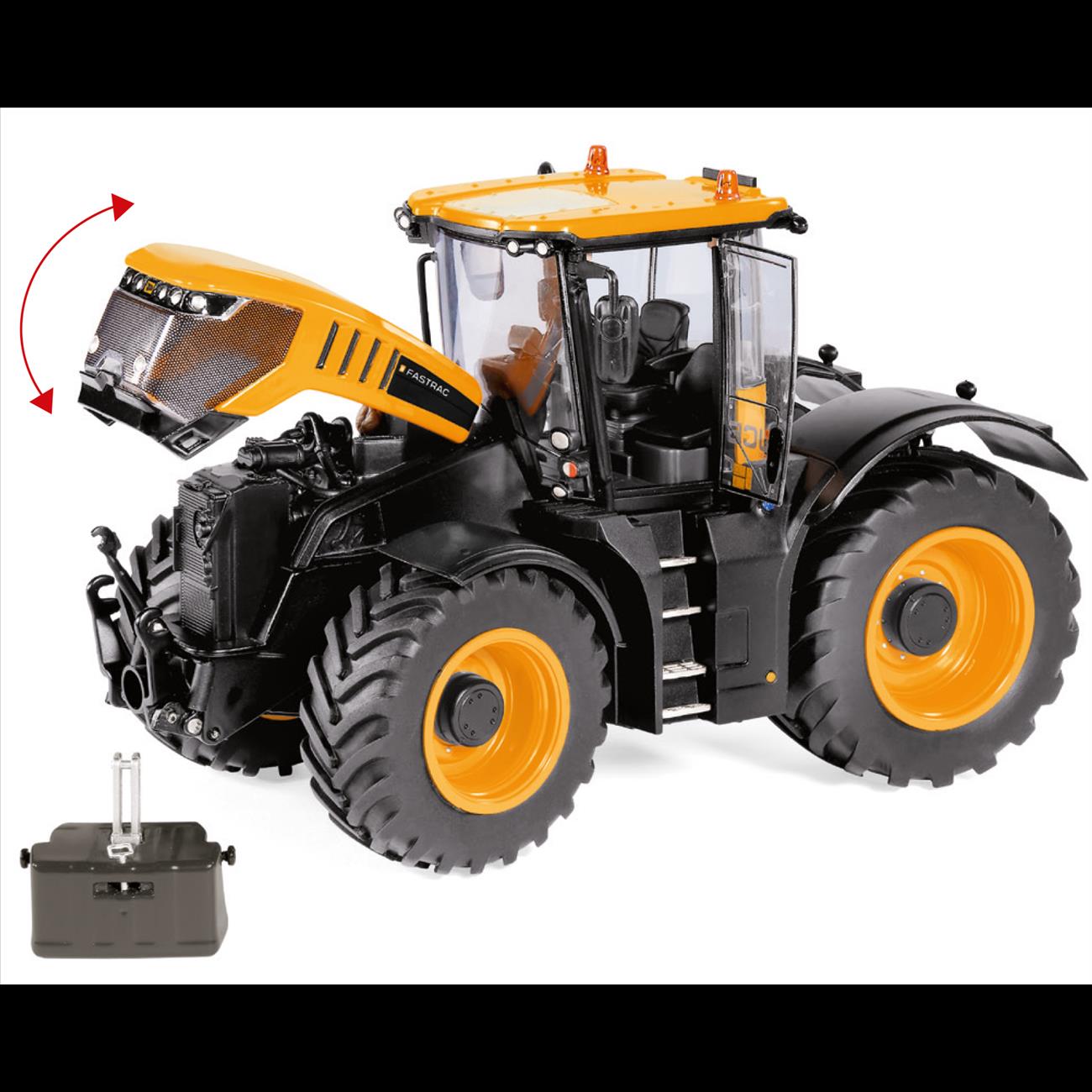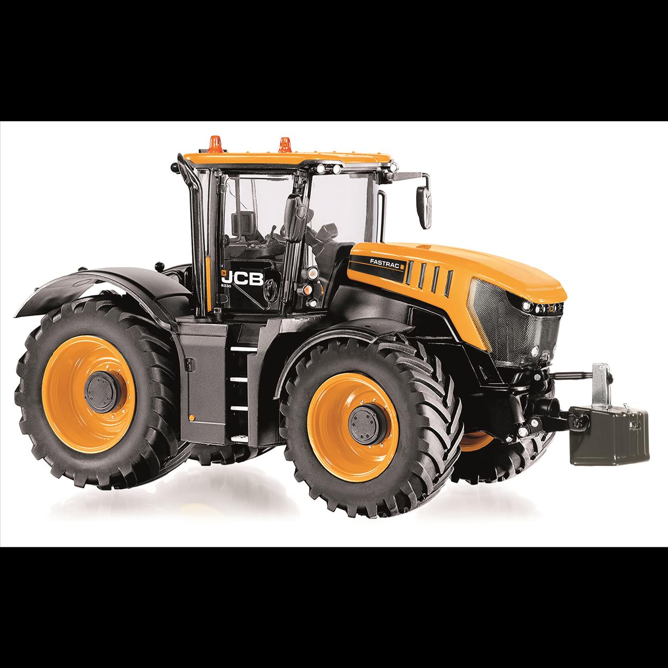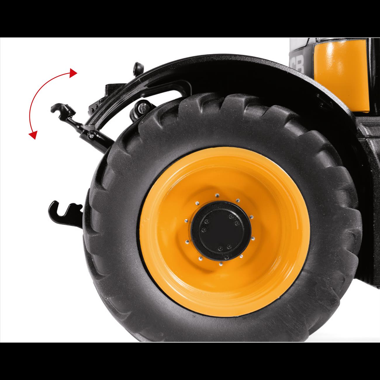 JCB Fastrac 8000 – die Typenpremiere bei WIKING Der Fastrac 8330 ist das neue Flaggschiff von JCB. Mit seinen 335 PS Schlepper hat WIKING den Vielzweck-Schlepper nach dessen Vorstellung zum 25. Jubiläum von Fastrac miniaturisiert. Vom Fahrgestell über die prägnanten Karosserieelemente bis hin zum Cockpit des Fahrers lassen die Traditionsmodellbauer dem Fastrac größte Sorgfalt angedeihen. Nachgebildet wurde in der neuen Command Plus-Kabine natürlich ein Komfortsitz inklusive der verschiedenen Steuerelemente. Die Kabine erscheint leicht nach vorne geneigt, was die Sicht verbessern und gegen Sonneneinstrahlung schützen soll. Die neue Fastrac-Baureihe orientiert sich optisch und auch in den technischen Details an der Fastrac 4000er-Baureihe, jedoch fällt die neue markante Linienführung und die neue Command Plus-Kabine sofort ins Auge. Das Vorbild von einer Breite von 2,55 Meter und einer Länge von 5,65 Meter setzt in der 32-fachen Miniaturisierung den Rahmen für das imposante Erscheinungsbild des 348 PS starken Schleppers. Dem Fahrer stehen beim Vorbild am Touchscreen-Display verschiedene Modi zur Auswahl, bei denen die verschiedenen Optionen Leistung, Wirtschaftlichkeit, konstante Zapfwellendrehzahl oder konstanter Feld- oder Straßengeschwindigkeit priorisiert werden können. Alles in allem ein Mehrzweckschlepper, der in der Landwirtschaft, aber auch im Bauhofbetrieb zum Einsatz kommt. JCB Fastrac in 1:32 bereitet auf Anhieb Modellspaß Bei WIKING ist damit ein hochdetailliertes Modell entstanden, dessen Vorder- und Hinterreifen gleichermaßen über landwirtschaftliches Profil verfügen. Dabei sind die Felgen sichtbar detailfein nachgebildet – die Räder lassen sich überdies wechseln. Die komplette Bodengruppe sowie die Motorhaube, die sich öffnen lässt, fertigen die Traditionsmodelbauer aus Metall. Gleiches gilt für den Unterlenker. Derweil formt WIKING die Kotflügel, aber auch den Oberlenker, den Tank und die gesamte Kabine aus Kunststoff, was den vorbildgerechten Charakter unterstreicht. Die Scheinwerfer sind transparent eingesetzt, gleiches gilt für die orangetransparenten Rundumleuchten am beidseitigen Kabinenheck. Darüber hinaus optimieren die feinen Bauteile von Auspuff, Spiegel, Aufstiegsgitter und Treppen sowie das Frontgewicht den JCB Fastrac in 1:32. Modellspaß bereitet auf Anhieb die feindetaillierte Pendelachse vorne, aber auch die präzise lenkbare Vorderachse. Unter der geöffneten Motorhaube präsentiert sich das mächtige Aggregat. Sowohl die Unter- als auch die Oberlenker vorne und hinten erweisen sich als voll beweglich, gleiches gilt auch für die schwenkbaren Außenspiegel. Während sich die beiden Kabinentüren öffnen lassen und damit einen noch besseren Einblick ins Cockpit ermöglichen, kann die Heckkupplung in der Höhe justiert werden.