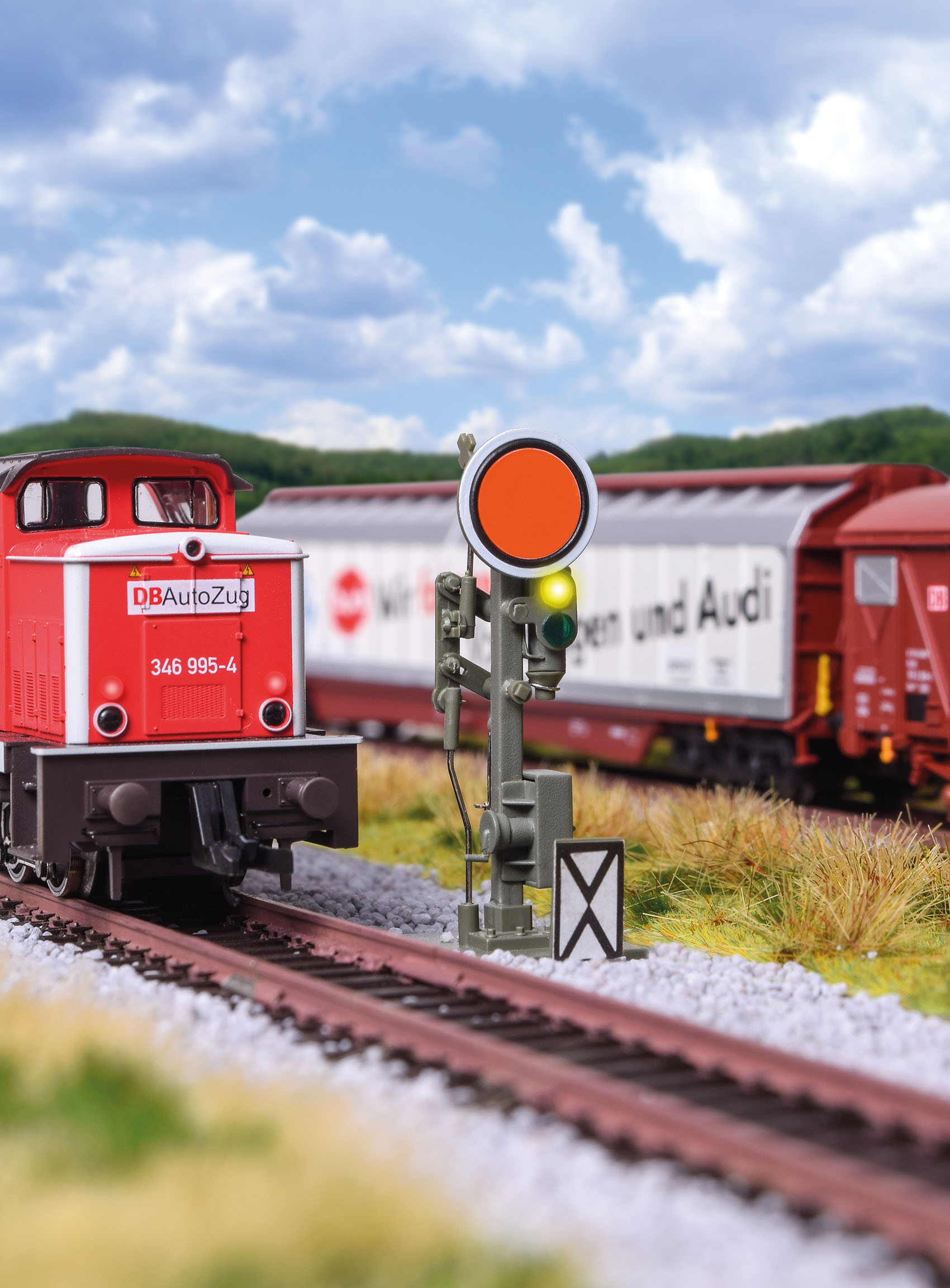 - Mit filigranem Messingmast in originalgetreuer Lackierung, bedruckter Signalscheibe und Unterflur-Kompaktantrieb. Integrierte Schaltkontakte sorgen für eine echte Zugbremsung bei Halt erwarten. Für eine echte Langsamfahr-Funktion wird lediglich noch der Langsamfahrwiderstand Art. 5216 benötigt. Wartungsfrei dank LED-Beleuchtung. Signalbilder Vr0 und Vr1. Höhe: 2,6 cm. Einbautiefe: 68 mm.